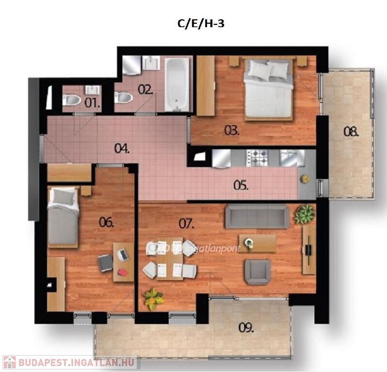 Lakások mérete: 43 nm-es, 1,5 szobás lakástól a 150 nm-es, 5 szobás és a tetőteraszos, exkluzív penthouseig.