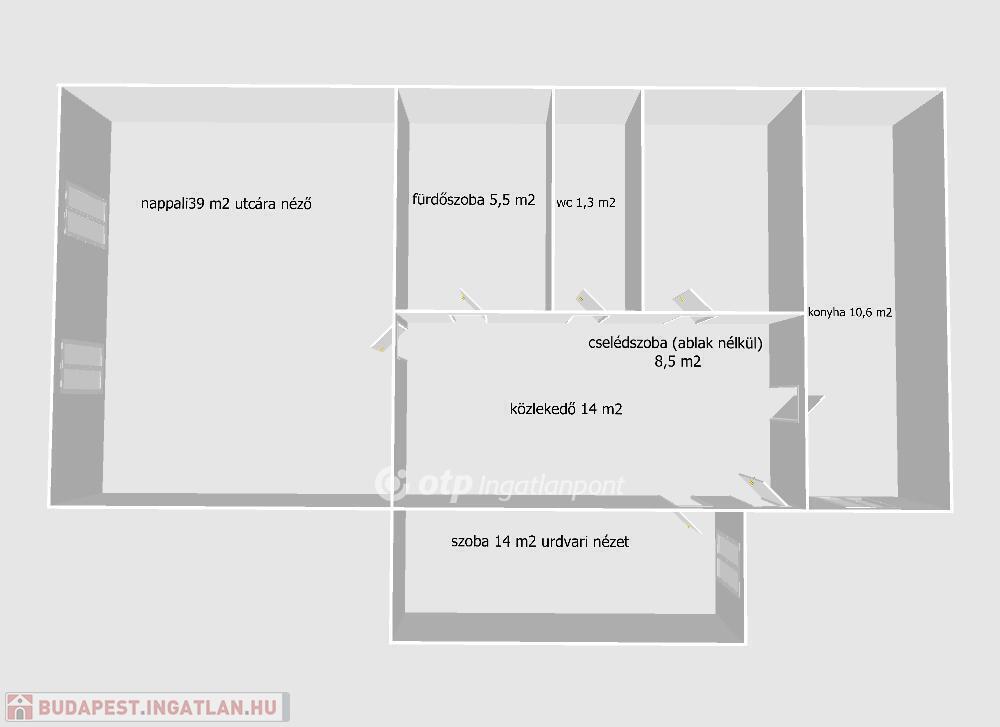 Az ingatlan teljesen FELÚJÍTANDÓ, a konyha melletti cselédszoba falának kivételével egy nagyobb konyha is kialakítható.