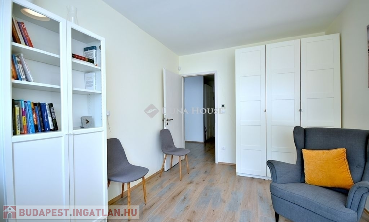 Budapest, 12. kerület Városmajor utcában, 2018-ban épült társasház első emeletén, tágas belső kertre néző, napfényes, nappali + hálós, amerikai konyhás, távolról vezérelhető mennyezeti hűtő-fűtő rendszerrel ellátott lakás, teremgarázs beállóval és tárolóval. A fűtés hőjét geotermikus hőszivattyús rendszer biztosítja. Az ingatlan gépesített, hűtőszekrény fagyasztóval, mosogatógép, mosógép, elszívó, főzőlap, sütő és mosógép, riasztó és az elektromos redőnyök is a felszereltség részei. A közös költség vízzel, fűtés és hűtés előleggel együtt 46.000 Ft, azaz ezen felül villanyt, és igény szerint internet és TV előfizetést kell fizetni.A teremgarázs beálló 17 MFt-ért, és mögötte a saját tároló 3 MFt-ért eladó.