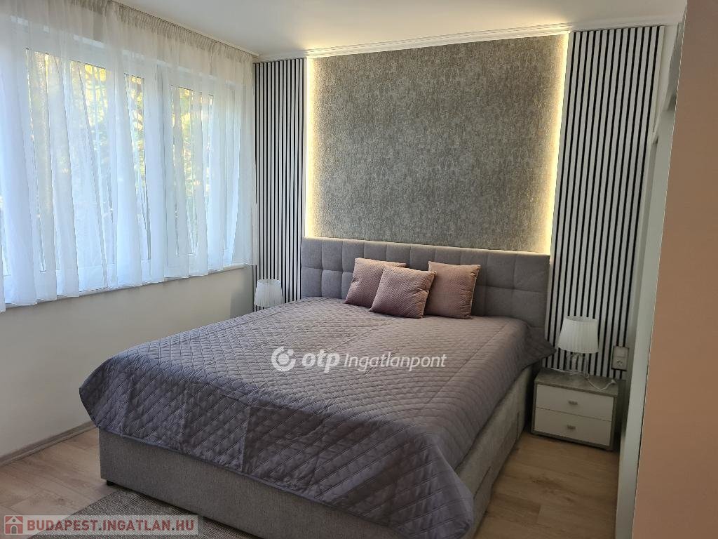 Hálószoba: ágyneműtartós franciaágy, éjjeliszekrények, gardrób és komód