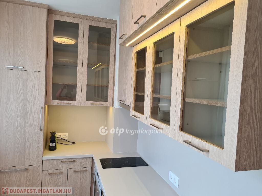 Konyha: beépített bútor, kerámia főzőlap, sütő, hűtő, mosogatógép, kapszulás kávéfőző
