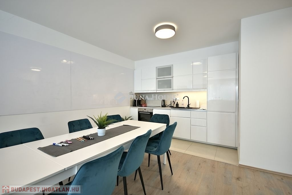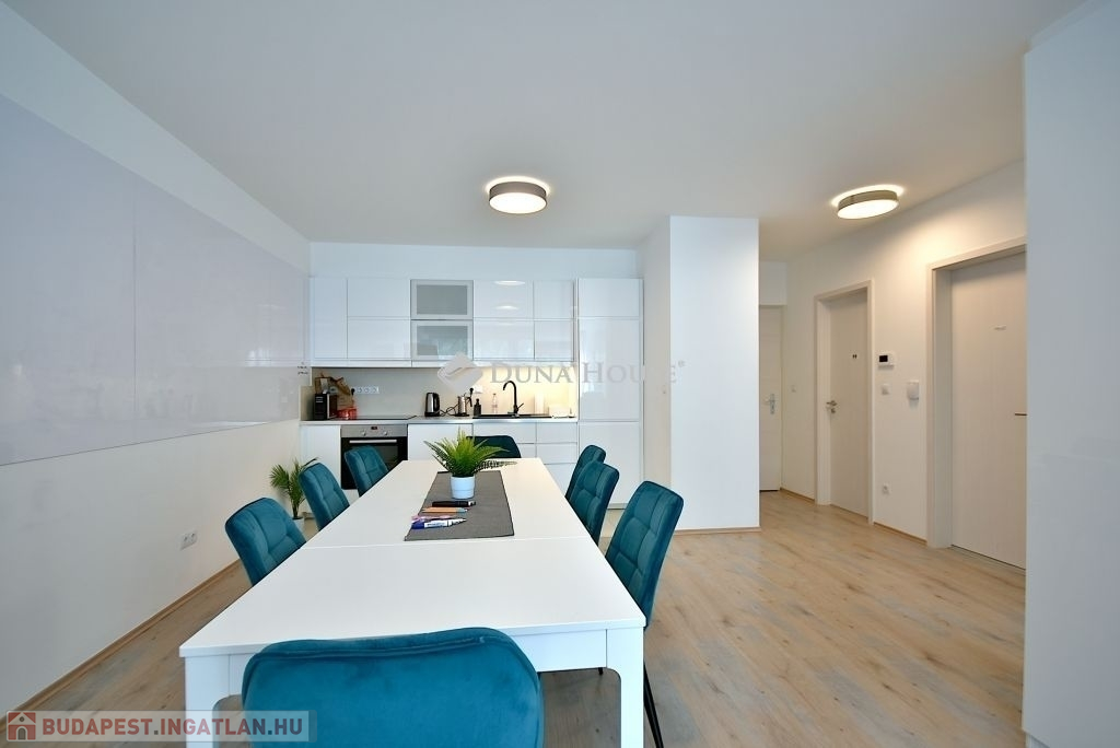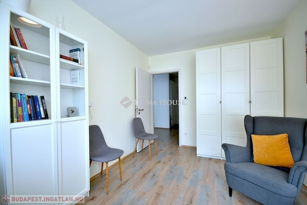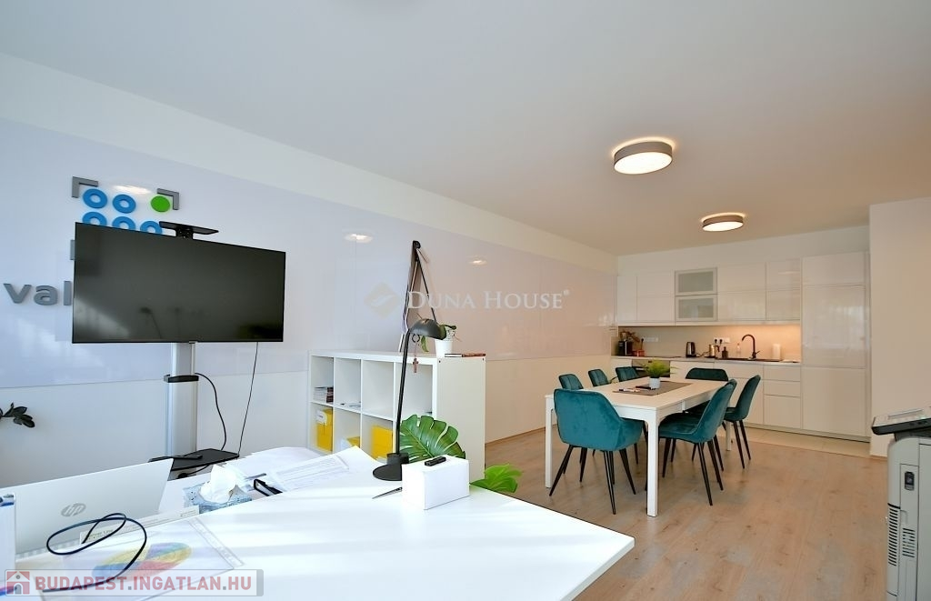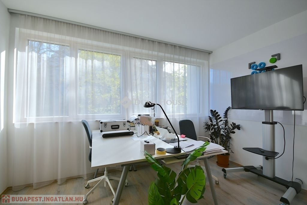 Budapest, 12. kerület Városmajor utcában, 2018-ban épült társasház első emeletén, tágas belső kertre néző, napfényes, nappali + hálós, amerikai konyhás, távolról vezérelhető mennyezeti hűtő-fűtő rendszerrel ellátott lakás, teremgarázs beállóval és tárolóval. A fűtés hőjét geotermikus hőszivattyús rendszer biztosítja. Az ingatlan gépesített, hűtőszekrény fagyasztóval, mosogatógép, mosógép, elszívó, főzőlap, sütő és mosógép, riasztó és az elektromos redőnyök is a felszereltség részei. A közös költség vízzel, fűtés és hűtés előleggel együtt 46.000 Ft, azaz ezen felül villanyt, és igény szerint internet és TV előfizetést kell fizetni.A teremgarázs beálló 17 MFt-ért, és mögötte a saját tároló 3 MFt-ért eladó.