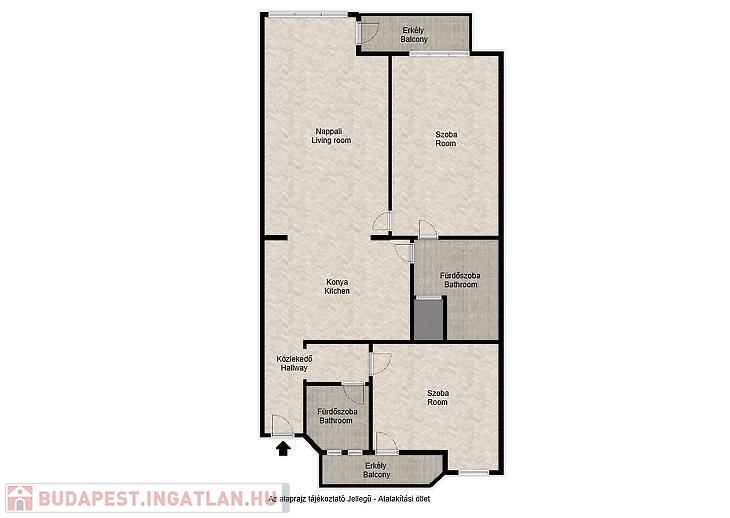 A lakás központi helysége egy 15 nm-es hall, szomszédságában találjuk a 23 nm -es, utcai nézetű, dél-keleti fekvésű, erkélykapcsolatos nappalit, a 18 nm-es hálószobát és a fürdőt.