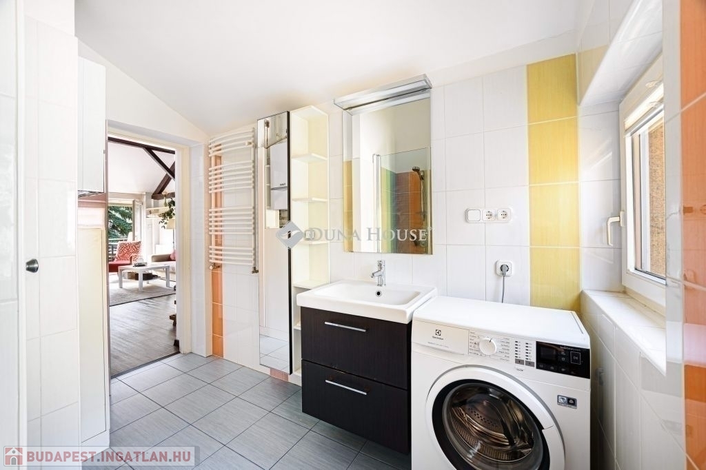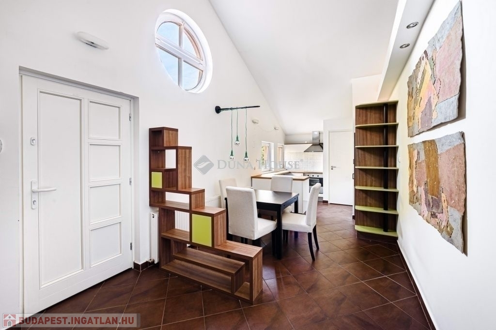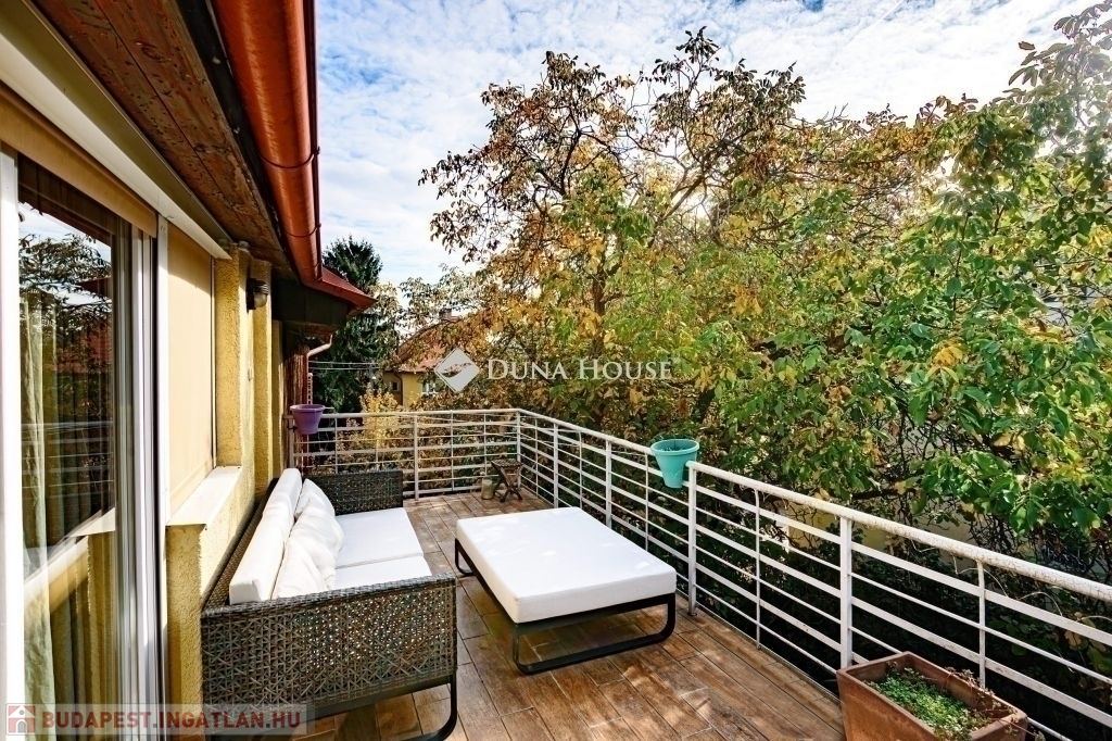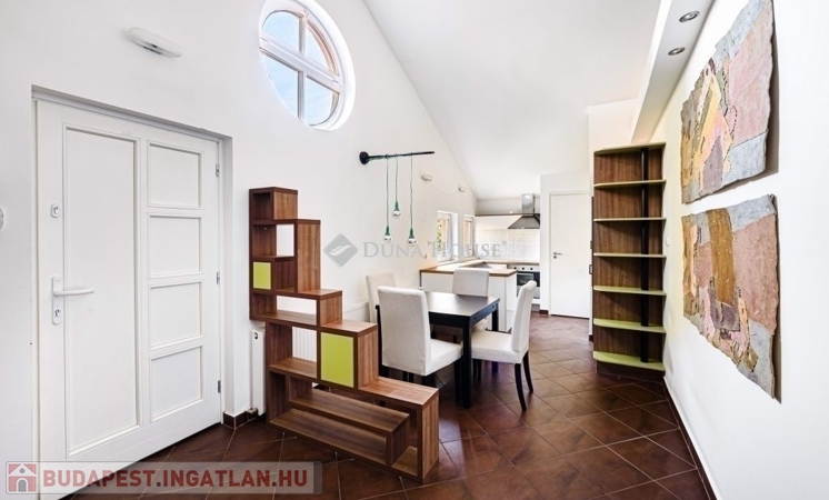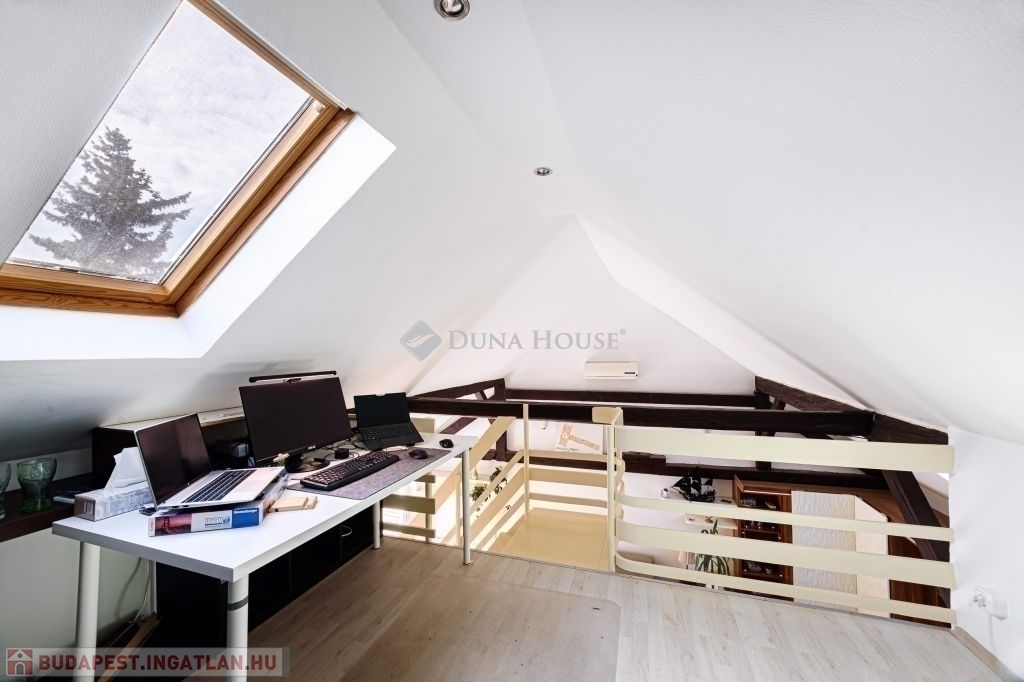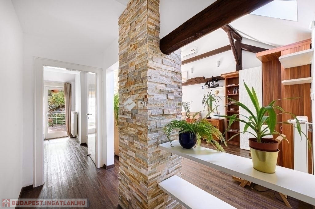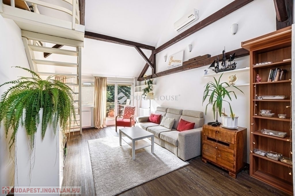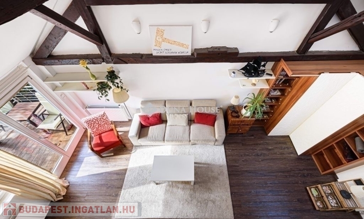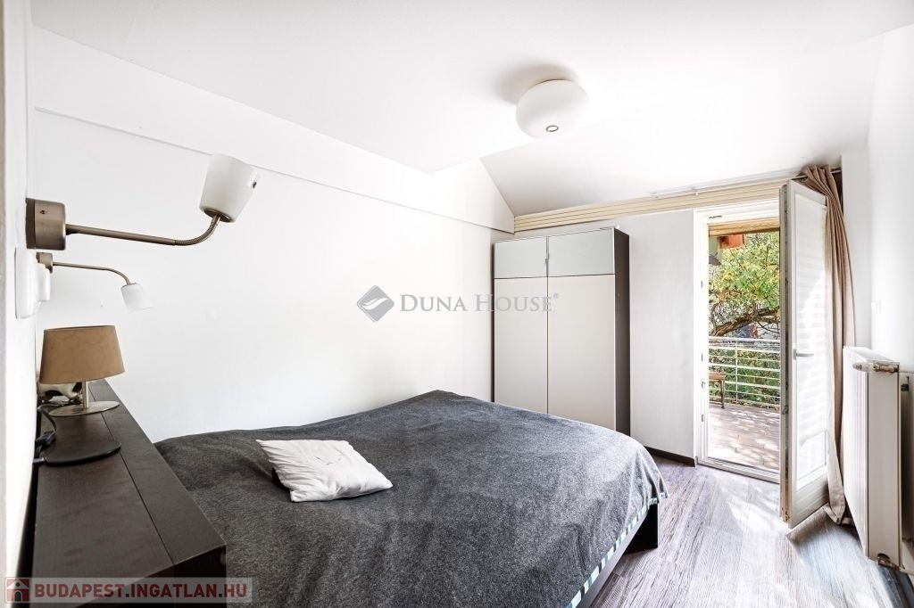 Napsütötte, tágas, teraszos otthon - KissvábhegyenBudapest egyik legkedveltebb, zöldövezeti részén, a XII. kerület Kissvábhegyén, az Ügyész utcában kínálunk megvételre egy különleges hangulatú, 80 m²-es, belső kétszintes lakást, 12 m²-es, napfényben fürdőző, kertre néző saját terasszal.A lakás egy elegáns, háromlakásos villaépület legfelső szintjén helyezkedik el, így teljes intimitást és nyugalmat biztosít tulajdonosának.A lakás különlegességei:- Lélegzetelállító terek és fényár a 4 méteres belmagasság, valamint a rusztikus, látszó gerendás nappali egyedi karaktert kölcsönöz az otthonnak.- Kivételes tárolókapacitás ízlésesen beépített szekrények és tágas gardrób biztosítanak rendszerezett életteret.- Csendes, zöld környezet, mégis kiváló közlekedés a belváros mindössze percek alatt elérhető. (Busz: 21, 39, 102, 210, 212 Villamos: 17, 59, 61 M2 metró: 10 perc séta)A lakás elrendezése:- elegáns előszoba- konyha-étkező + kamra- tágas nappali rusztikus látszógerendákkal, közvetlen teraszkapcsolattal- kényelmes méretű hálószoba, szintén kijárattal a teraszra- stílusos fürdőszoba zuhanykabinnal és WC-el- a galériaszinten egy nyitott, világos dolgozó- vagy vendégszoba, beépített gardrób és extra tárolófelületekA lakás a villa felső szintjén, kb. másfél emelet magasságban található. A hozzá vezető zárható, kizárólagos használatú lépcsőház további biztonságot és extra tárolási lehetőséget kínál.A lakás teljes körű felújításon esett át, és azóta is gondosan karbantartott.Cirkófűtés és klímaberendezés gondoskodik az évszakokhoz illő kényelemről.Külső adottságok:A villa egy 1070 m²-es, ősfás, parkosított telken helyezkedik el. A lakáshoz saját kerthasználat tartozik, ahol homokozó-játszórész, grillterasz, pihenőkert vagy veteményes is kialakítható.A kényelmet saját udvari gépkocsibeálló és külön külső tároló is szolgálja, melyek árát a vételár tartalmazza!!!Ez az ingatlan tökéletes választás azoknak, akik egy napfényes, hangulatos, otthonos lakást keresnek a XII. kerület egyik legjobb részén, ahol a zöld környezet és a városi kényelem találkozik.Ha Ön is egy egyedi atmoszférájú, magas minőségű lakásra vágyik Budapest egyik legkívánatosabb részén, keressen bizalommal a részletekért és a megtekintés egyeztetéséhez!