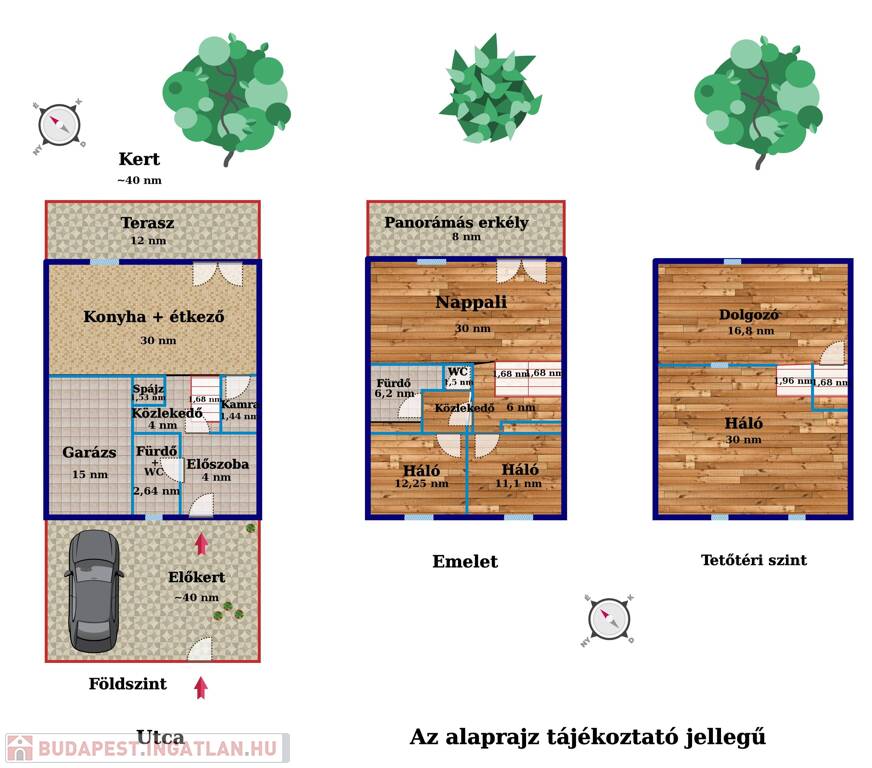 A ház négyes tagozódással rendelkezik, optimálisan szeparált, biztosítva ezzel a szükséges intimitást. A garázs, udvari beálló és saját elő- és hátsókert mind hozzájárulnak az otthon kényelméhez. A belső tágas két szintet további két szintre osztott tetőtér egészíti ki, így minden családtagnak kényelmes és privát teret biztosítva.