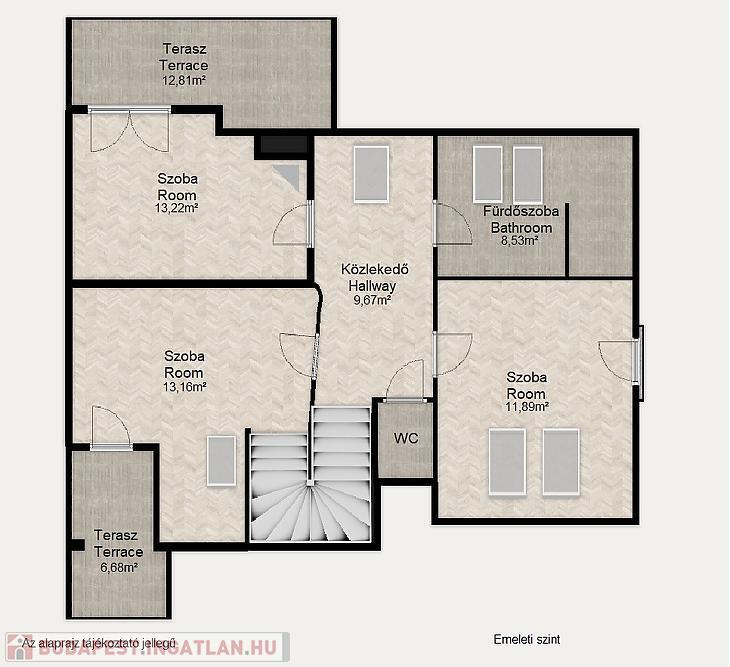 Az emeleti szinten 3 szeparált hálószoba, egy káddal és zuhanyzóval is felszerelt fürdőszoba, közlekedő, 2 terasz és egy franciaerkély lett kialakítva.