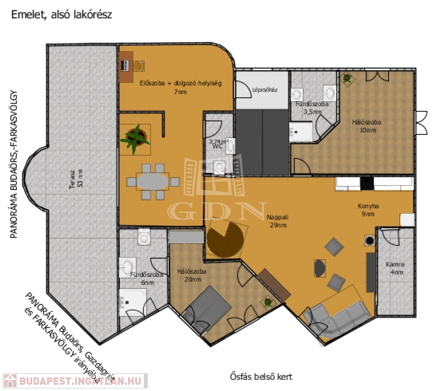 - Teraszok: 54 m2,