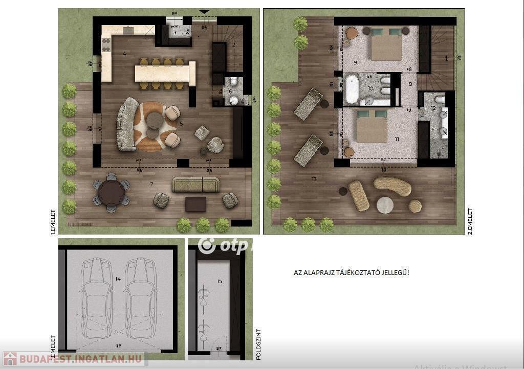 A 167 m2-es, 3 lakás belső kétszintes, kívülről közvetlenül és a kétállásos garázs felől is megközelíthető. Az előtérből a tágas nappali-étkező-konyha részbe lépünk. A nappali teljes frontján, illetve az étkező felőli oldalán is megközelíthető a 48 m2-es tágas terasz. A felső szinten további 2 hálószoba található, mindegyiknek saját fürdője van és mindkét hálóból megközelíthető a 63,8 m2-es terasz.