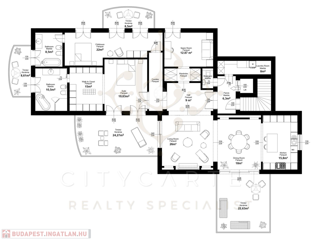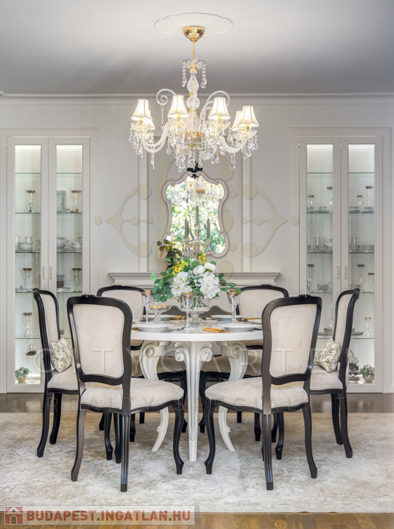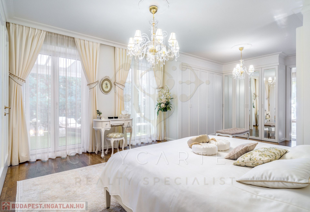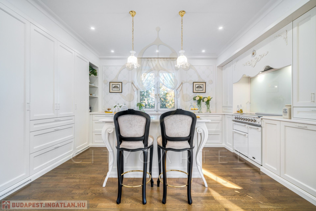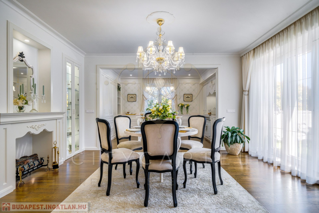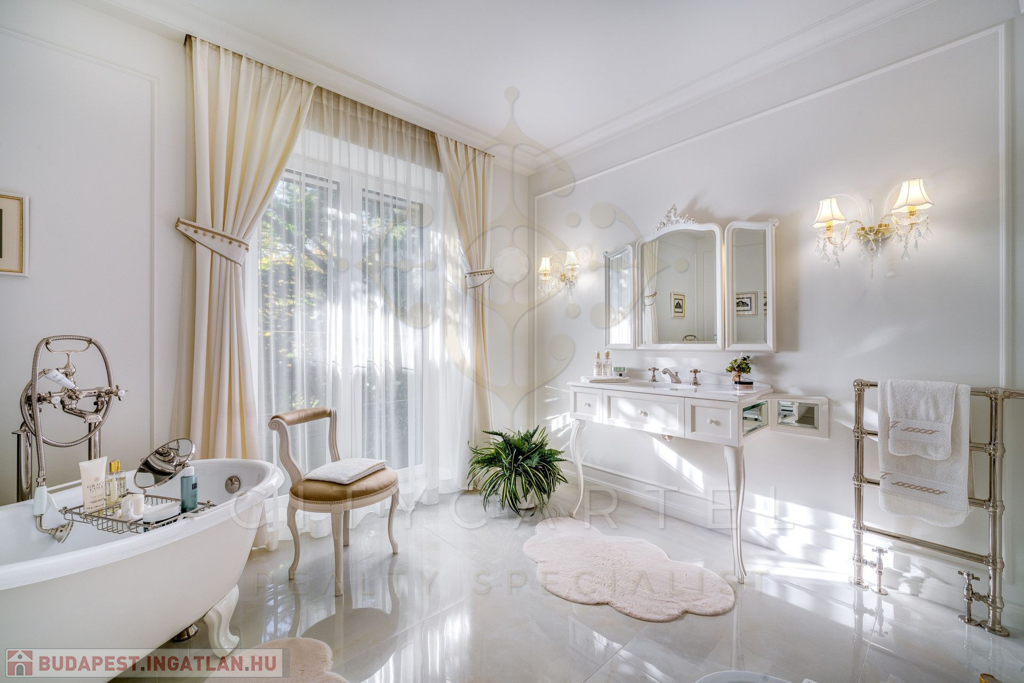A helyiségek berendezése minden luxusigényt kielégít, ahol az elegáns, aprólékosan kidolgozott modern-klasszikus enteriőr a kifinomult belsőépítészeti és lakberendezői munka tökéletes példája.