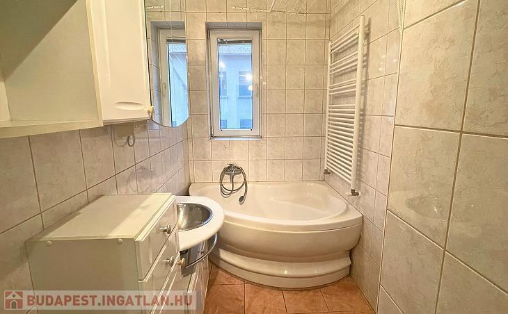 Konyhája világos, ideális méretű. Szomszédságában találjuk az ablakos, sarokkáddal szerelt fürdőszobát. A külön wc-t az előszobából közelíthetjük meg.