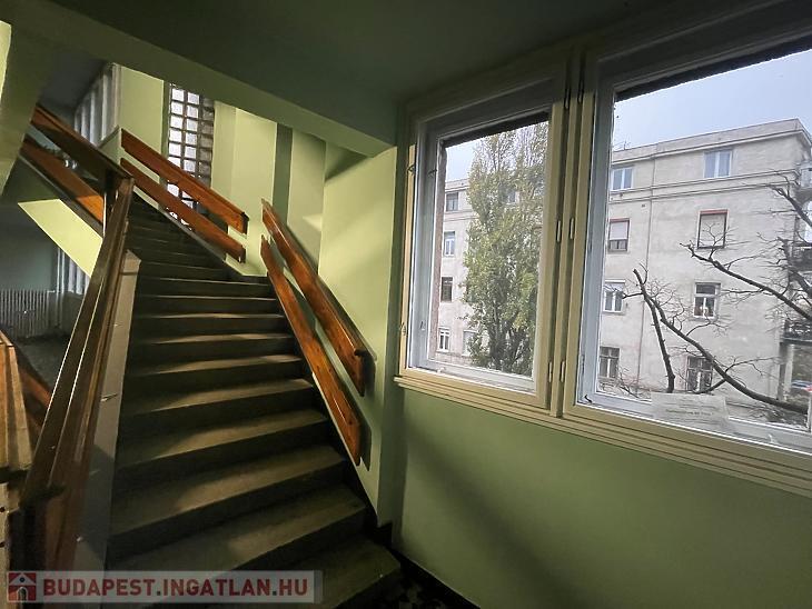 Az ingatlan az épület III. emeletén található, utcára és csendes hátsó kertre tekint dny-i és ék-i irányba.