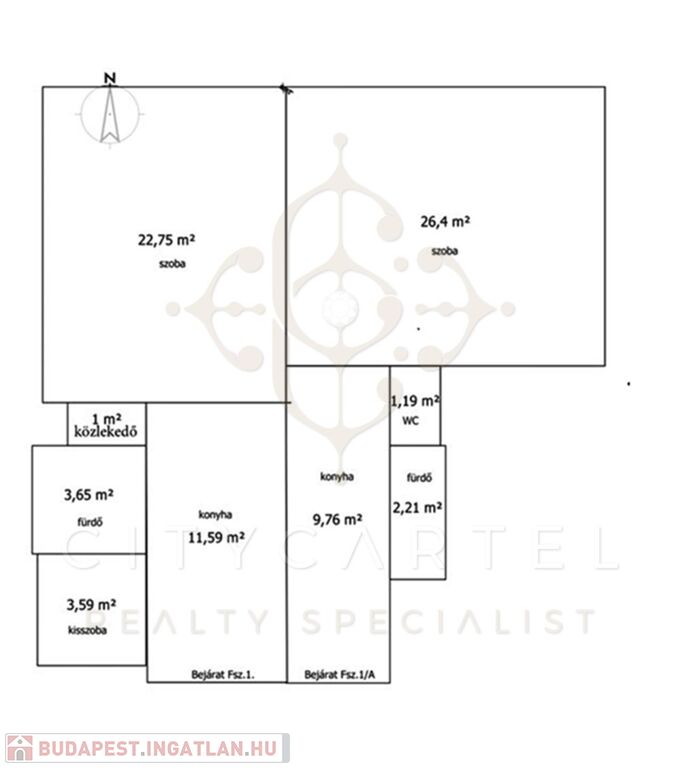 A bejáraton belépve a konyhába érkezünk, ahonnan balra található a kisszoba (3,5 nm) és a fürdőszoba, míg szemben a tágas nagyszoba (23 nm) kapott helyet.