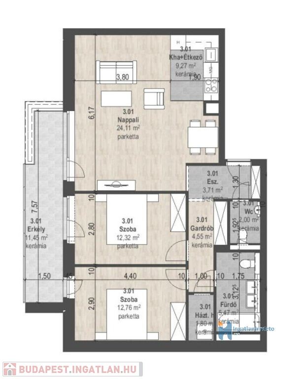 - fűtése: levegős hőszivattyús rendszer (padlófűtés, Fan-coil hűtés)