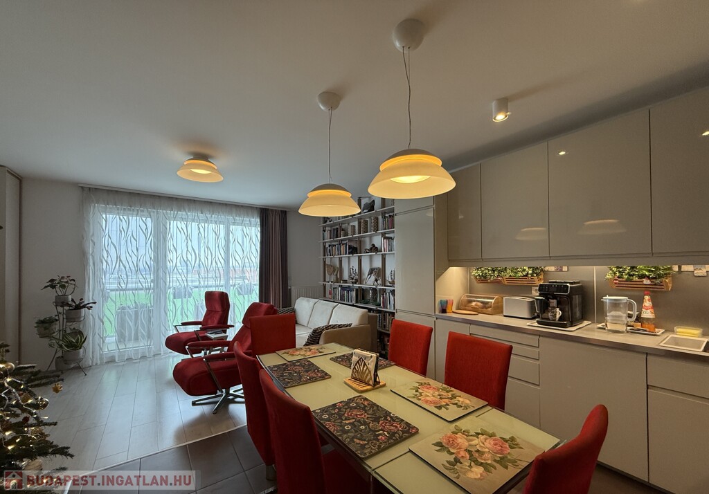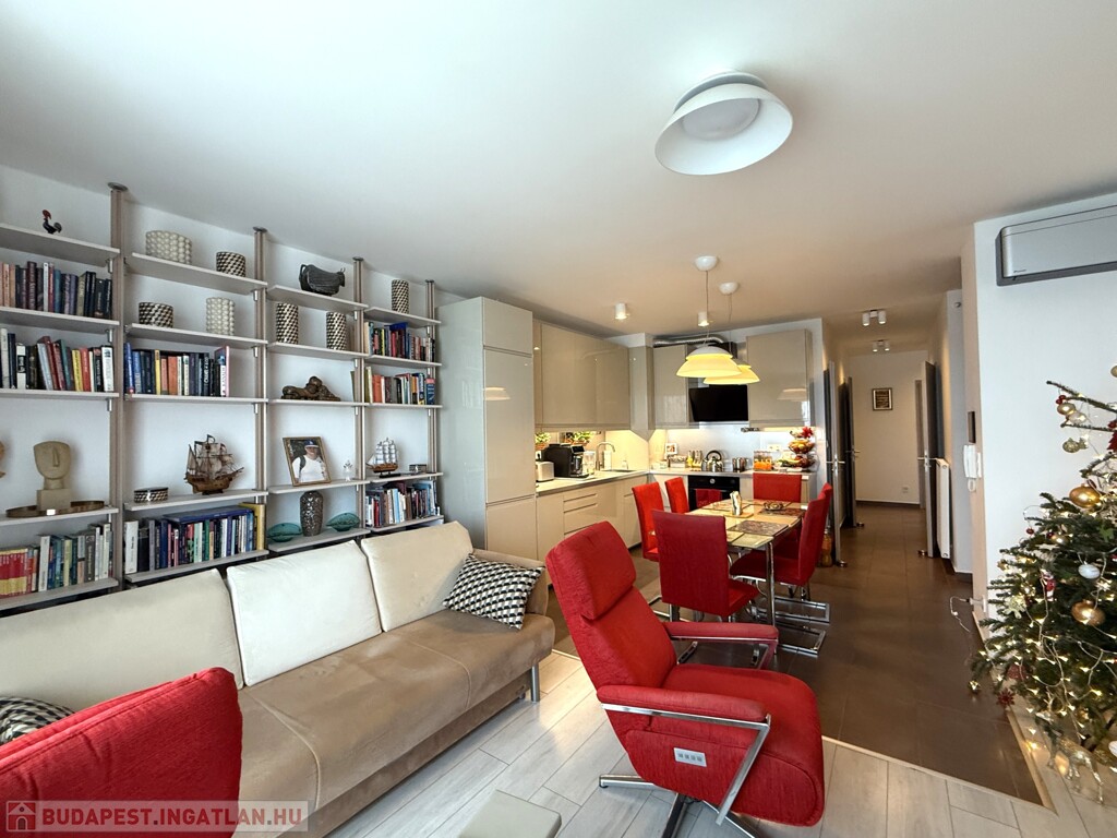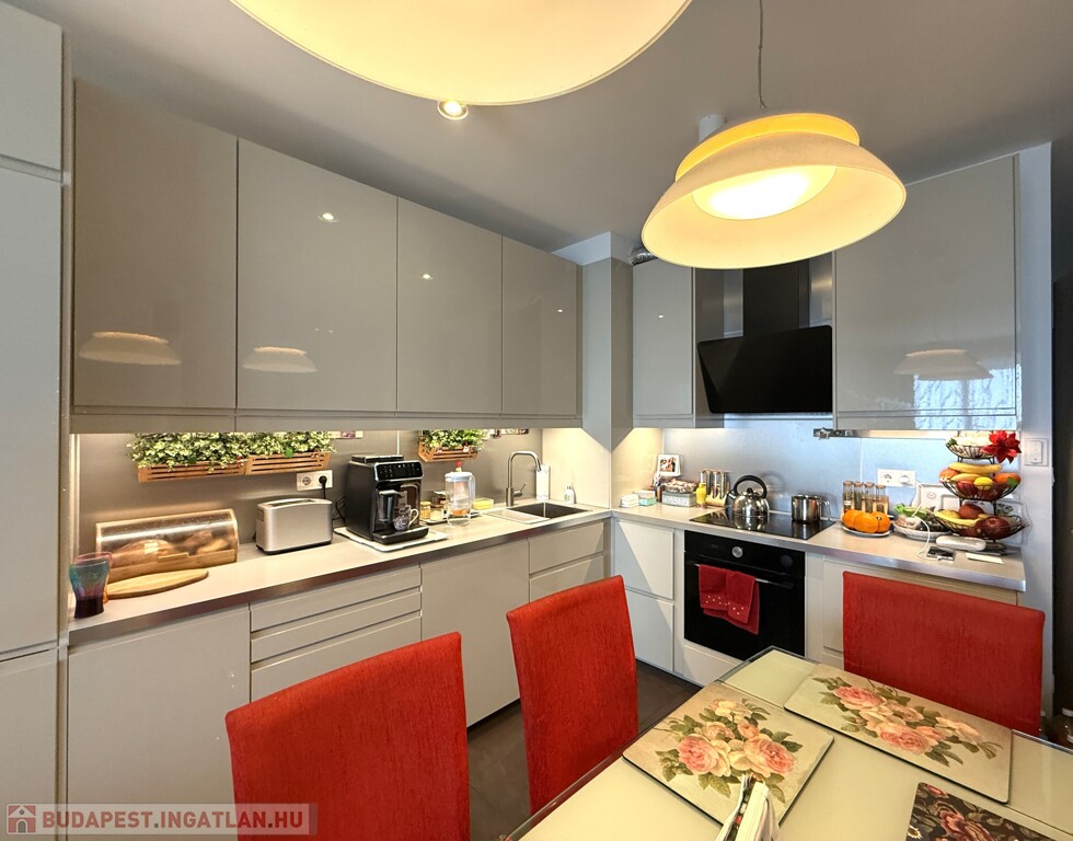 • elegáns nappalitér (kb. 22nm) tágas konyhával étkező térrel (összesen kb. 29nm),
