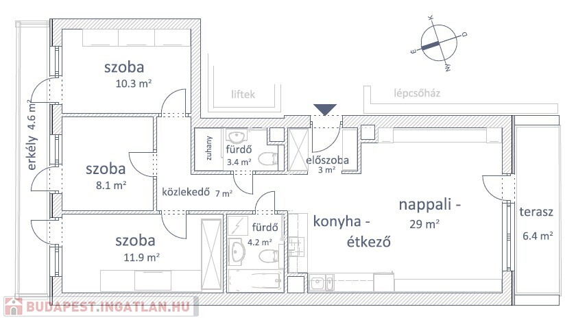 • önállóan nyíló 3 hálószoba, mindegyik közös erkélyre (kb. 4,6nm) nyílóan, teljes panorámával,