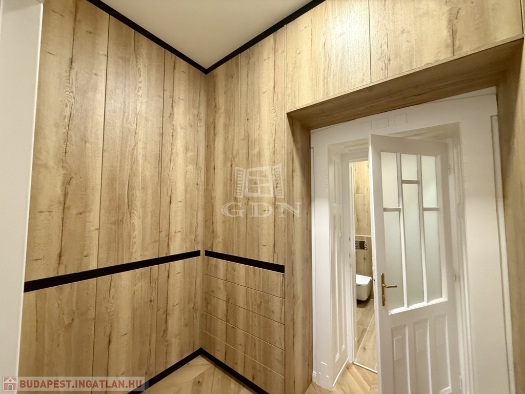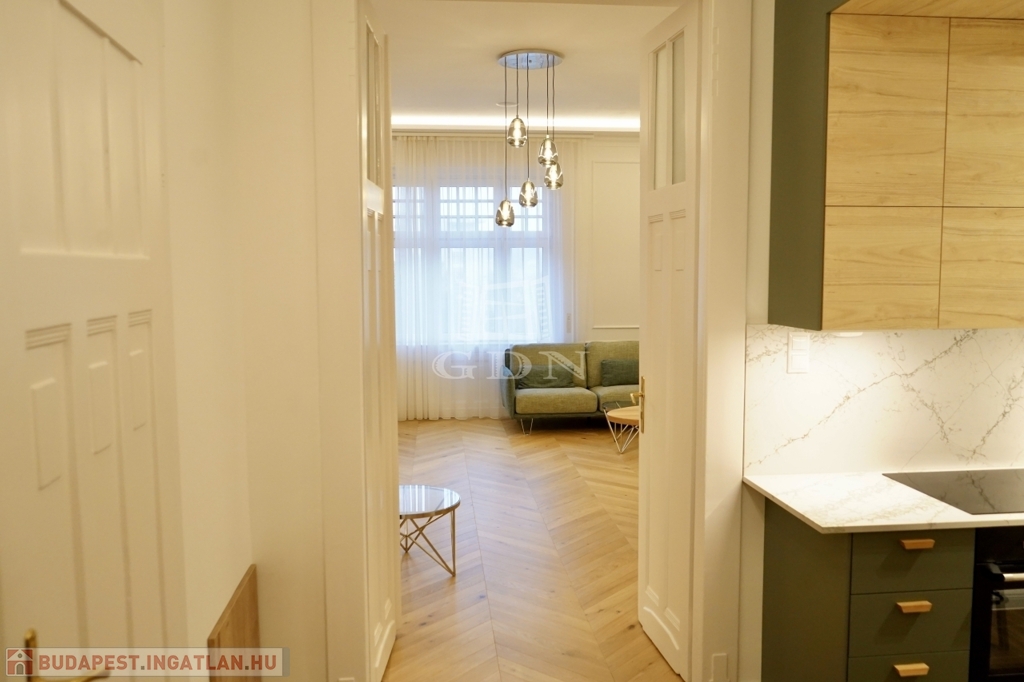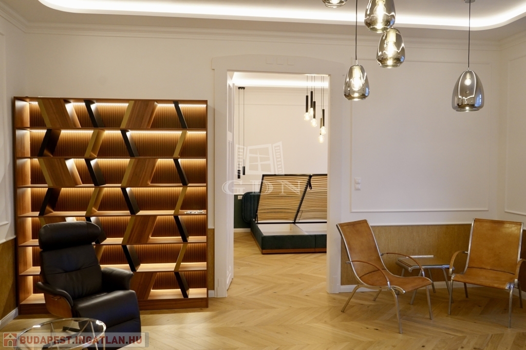 A 3,2 méteres belmagasság, a klasszikus halszálkamintás tölgyfa parketta és a felújított, patinás beltéri ajtók időtálló nagypolgári hangulatot teremtenek, amely harmonikusan kapcsolódik a modern megoldásokhoz. Az enteriőr kifinomultságát designlámpák és gondosan kiválasztott burkolatok erősítik, egységes és elegáns összképet alkotva.