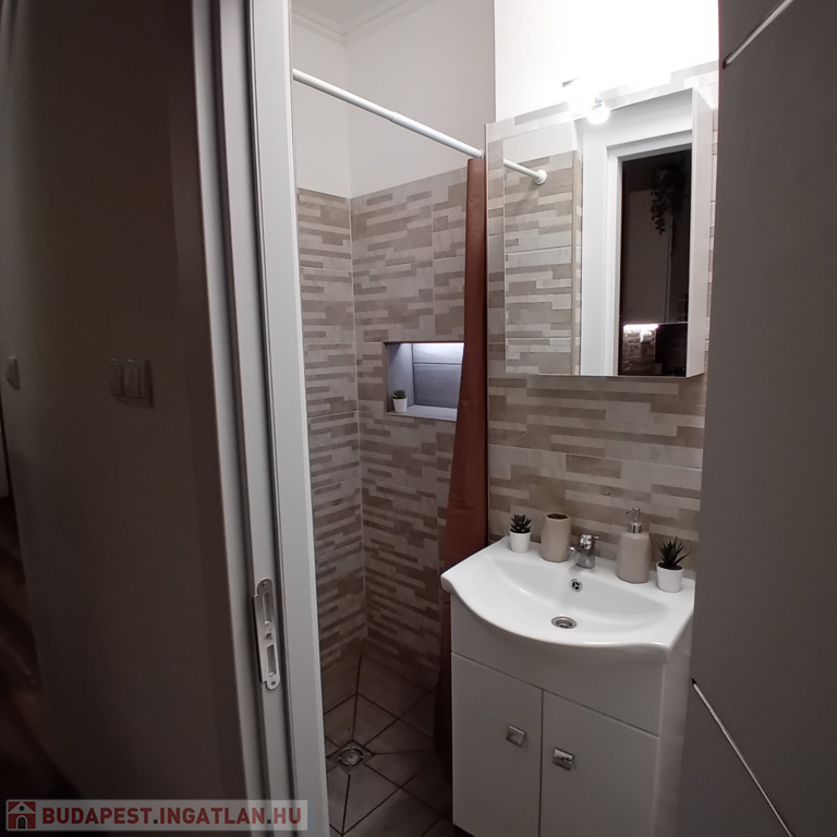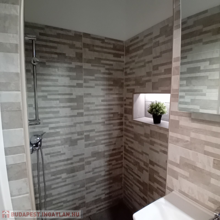 Az újonnan kiépített zuhanyzós fürdőszoba a hagyományos világítási technikákon túl szintén rendelkezik lokális fénytechnikával a falba süllyesztett polc körül. Mellette található a háztartási helyiség, melyben kényelmesen elhelyezhető a mosógép, valamint ideális tároló helyet biztosít.