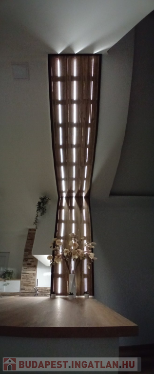 A konyhával egy légtérben található, tágas, 22,5 m2- es nappali két oszlopa és a konyhasziget Falipanelből készült burkolatot kapott, utóbbi esztétikai élményen túl fényforrást is rejt. A helyiség mennyezeti rejtett világítása és az elegáns, hangulatos, távirányítóval is működő mennyezeti lámpa ad nyugtató hangulatot, a természetes fényt biztosító erkélyajtó a ház gondozott kertjére néz.