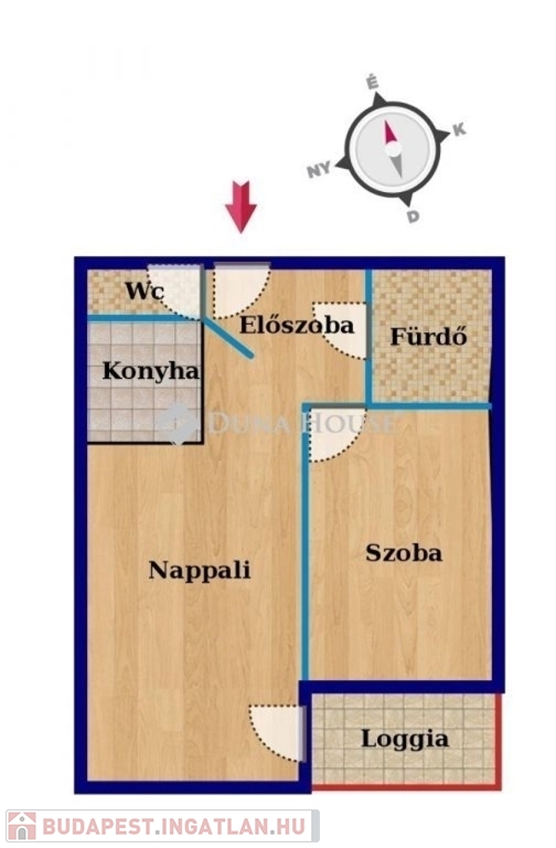 A lakás amerikai konyhás nappaliból, hálószobából, fürdőszobából WC-vel, valamint külön WC-ből áll. A szobák déli fekvésűek, világosak, a nappaliból egy hangulatos loggia nyílik.