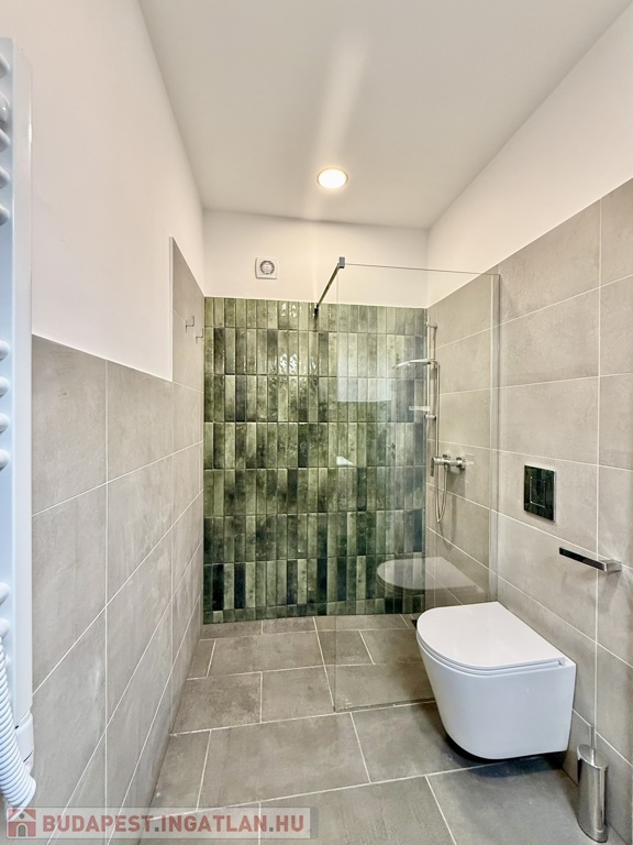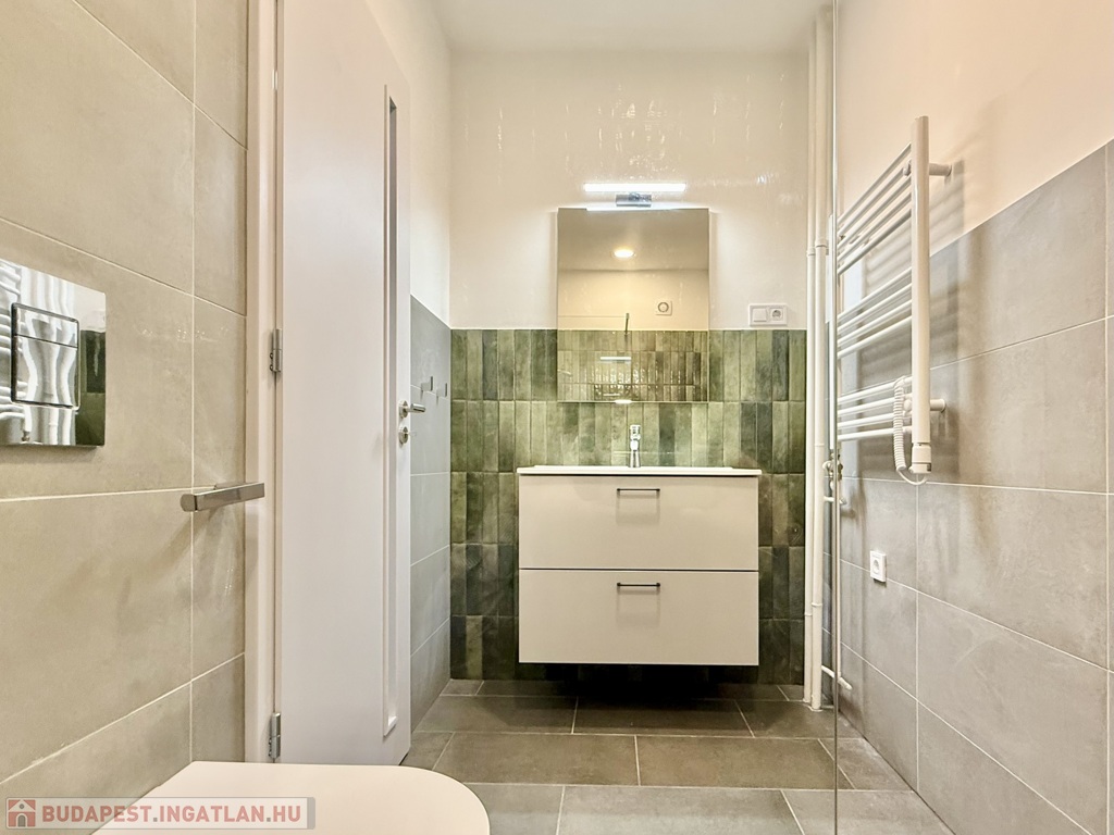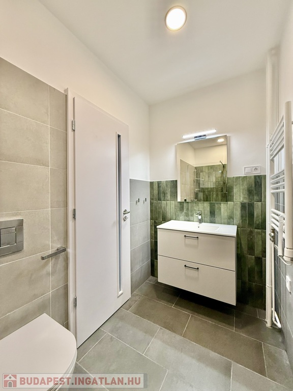 A fürdőszoba modern, elegáns kialakítású: sík üvegfallal határolt, épített zuhanyzó készült sötétzöld mázas kerámiával burkolt hátfallal, fiókos mosdószekrénnyel és törölközőszárítós radiátorral. A mosó- és szárítógép külön háztartási / gardrób helyiségben kapott helyet – amely igény szerint külön mosdó helyiséggé vissza alakítható -, növelve a lakás praktikus használhatóságát.