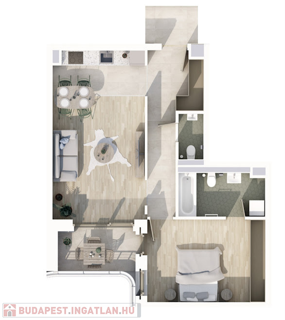 -Elrendezés: előszoba, fürdőszoba, konyha, nappali, hálószoba, WC, terasz.
