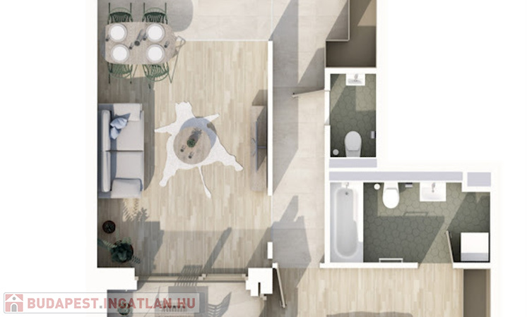 Beltéri padló: 8 mm laminált parketta és kerámia burkolat.