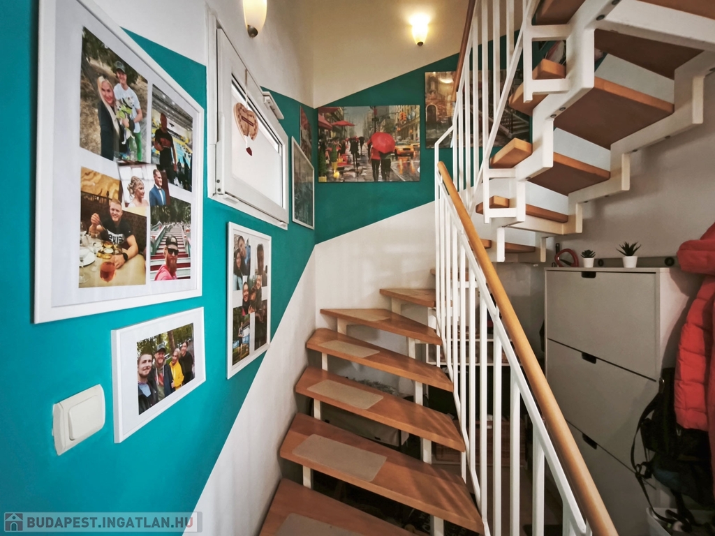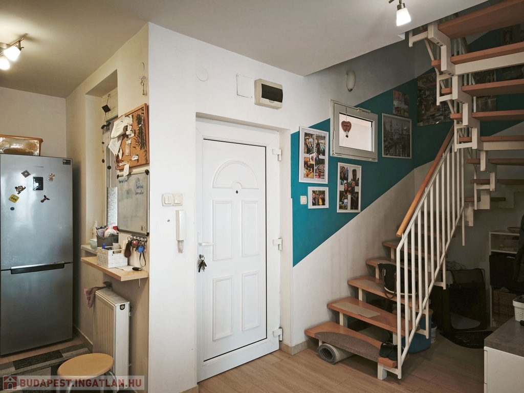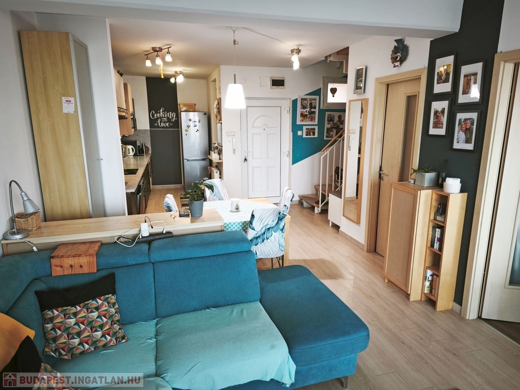 A lakás a biztonsági ráccsal ellátott folyosó végén helyezkedik el. A bejárattal szemben található egy saját 1,5 nm-es beépített külső tároló. A folyosó utolsó lakásaként a szintén biztonsági ráccsal védett bejárati ajtón belépve az alsó szinten a nagyon tágas 30 nm-es ízlésesen berendezett klímás, amerikai konyhás, nappaliba érkezünk, ami kényelmes teret biztosít a család mindennapi életéhez, közös időtöltéséhez. A konyha gépesített, ablakos , modern, bútorozott.