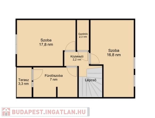 A felső szintre vezető lépcsőn a 2,2 nm-es közlekedőbe érkezünk, amiből jobbra nyílik a 16,8 nm-es laminált parkettás szoba, amit egy 2,3 nm-es jól kihasználható gardrób választ el a balra lévő 12,5 nm-es szintén laminált parkettás hálószobától.