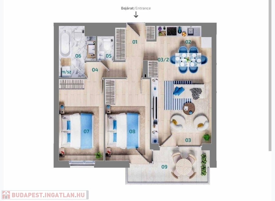 - Nettó hasznos alapterület: 67,62m² (A terasz 50 %-os redukálással szerepel)