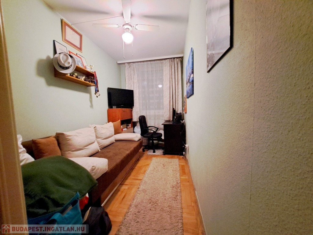 A 22 m²-es nappali fa parkettával burkolt, minőségi klímaberendezéssel felszerelt. A két, egyenként 8 m²-es félszoba szintén külön nyíló, jó állapotú fa parkettás helyiség. Az ablakos, világos konyhában gáztűzhely található és nagyméretű hűtőszekrénynek is van helye. A lakásban a régi fa nyílászárókat redőnnyel ellátott, hő- és hangszigetelt műanyag ablakokra cserélték. A szobák kivételével minden helyiség járólap burkolatú, a tárolási lehetőségeket pedig külön gardróbhelyiség is bővíti (emellett még van egy közös használatú tároló is a szinten, amelyet a szinten található 4 lakás lakói használnak).