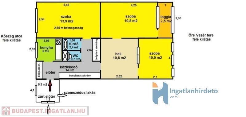 A konyha és az egyik nagyszoba a Kőszeg utca felé néz SZÉP kilátással, a másik két szoba déli irányba az Örs Vezér tere felé.