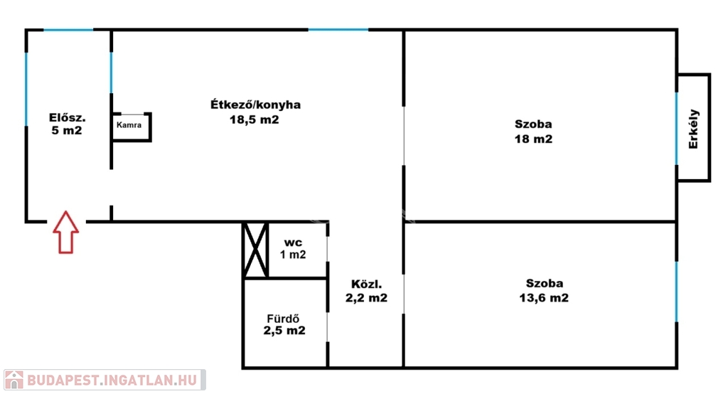 A lakás tulajdoni lap szerint 55 nm-es, 2 szobás. A tulajdonosok a társasháztól megvásároltak további 5 nm-t, mely előszobaként funkcionál.