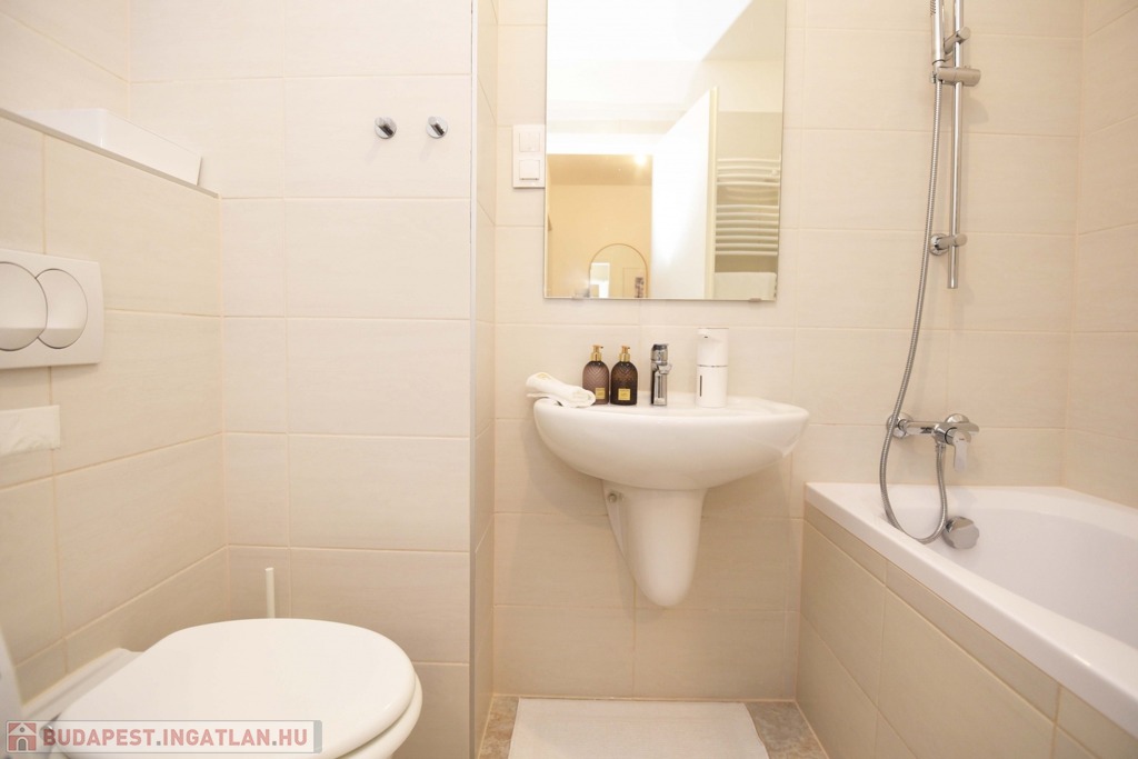 A 4,5 nm-es fürdőszoba kádas kialakítású, egy hosszú nap után kellemes kikapcsolódást nyújt egy nyugodt fürdő, miközben a világos, letisztult tér barátságos és kényelmes hangulatot teremt.