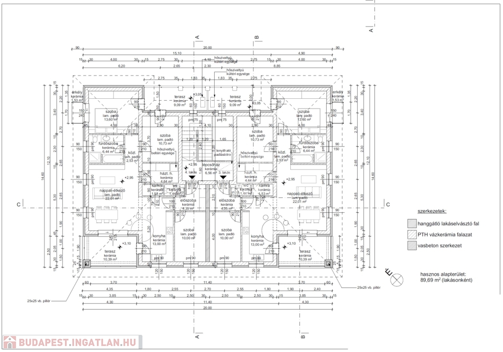 -Lakás alapterület: 89,69 m² + erkélyek 9,09 és 10,39 m²