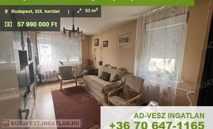 ELADÓ Budapest XIX. kerületének közkedvelt, zöldövezeti részén, az Arany János utcában egy jó állapotú, 9.emeleti, szélső, 53m2-es panellakás, liftes, alacsony fenntartási költségekkel.