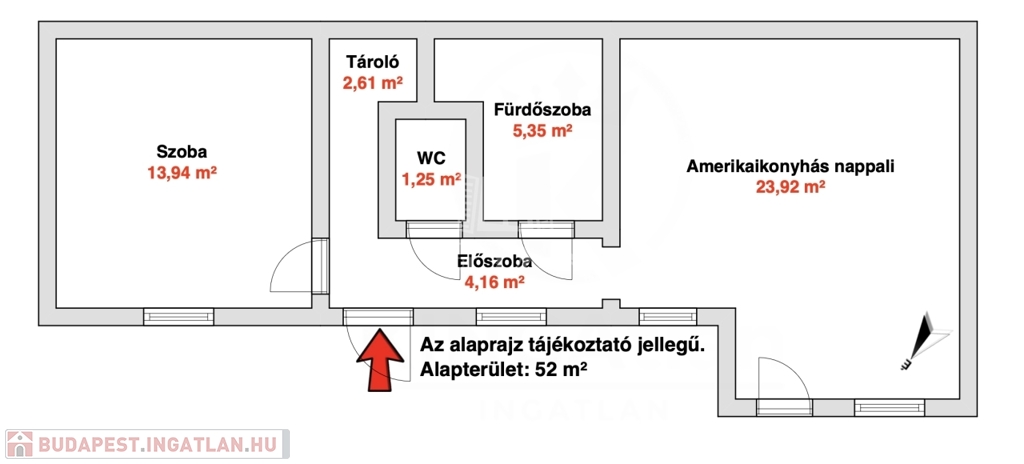 A lakás praktikus elrendezésű: amerikai konyhás nappali + hálószoba, továbbá külön fürdőszoba és WC szolgálja a kényelmet. A lakáson belül egy külön tárolóhelyiség is rendelkezésre áll.