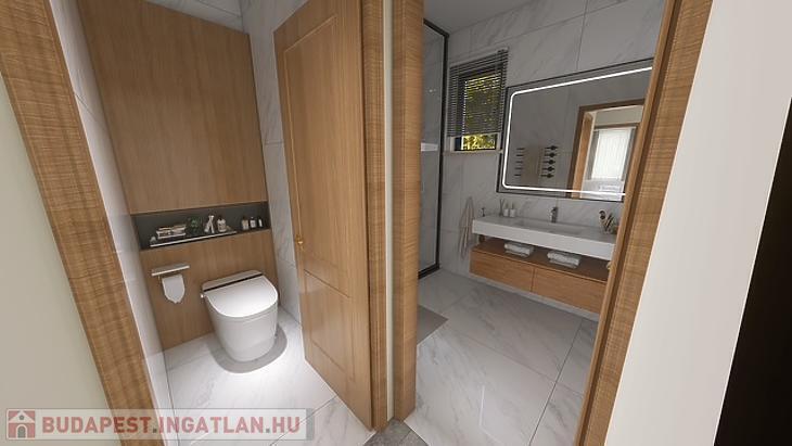 Hőszivattyús fűtés-fűtés rendszer (mennyezeti) és padlófűtés biztosítja a meleget. Az ár tartalmazza a burkolatokat, szerelvényeket és szanitereket is.