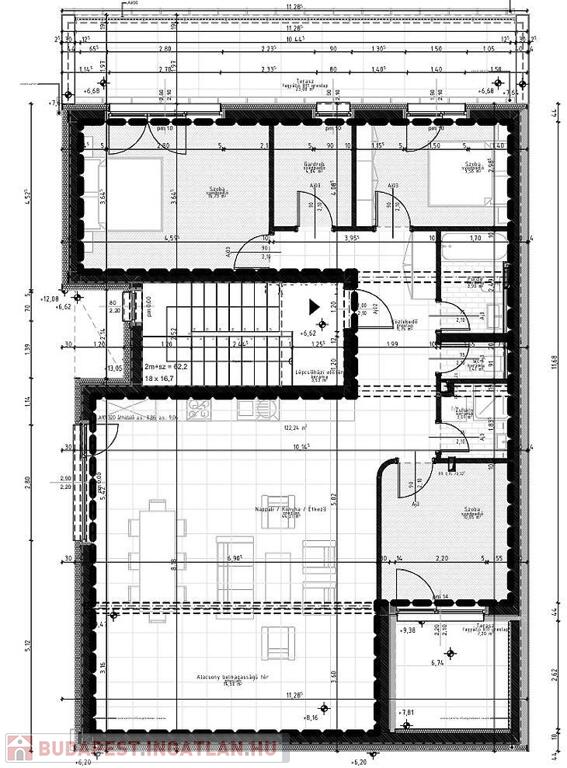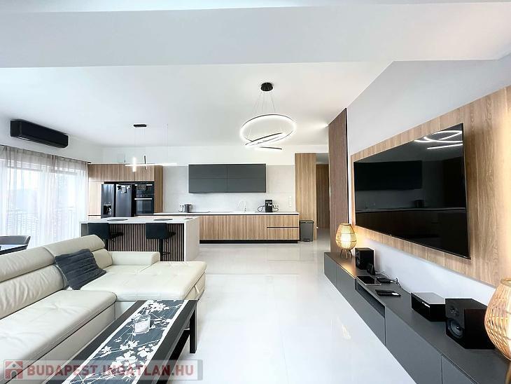 A lakásban egy 44 m2-es amerikai konyhás, étkezős nappali, 3 szoba, 2 fürdőszoba, előtér, közlekedő, mellékhelyiség és 2 terasz található (7 m2+ 23 m2). Gyönyörű, egyedi, minőségi burkolatok lettek beszerelve.