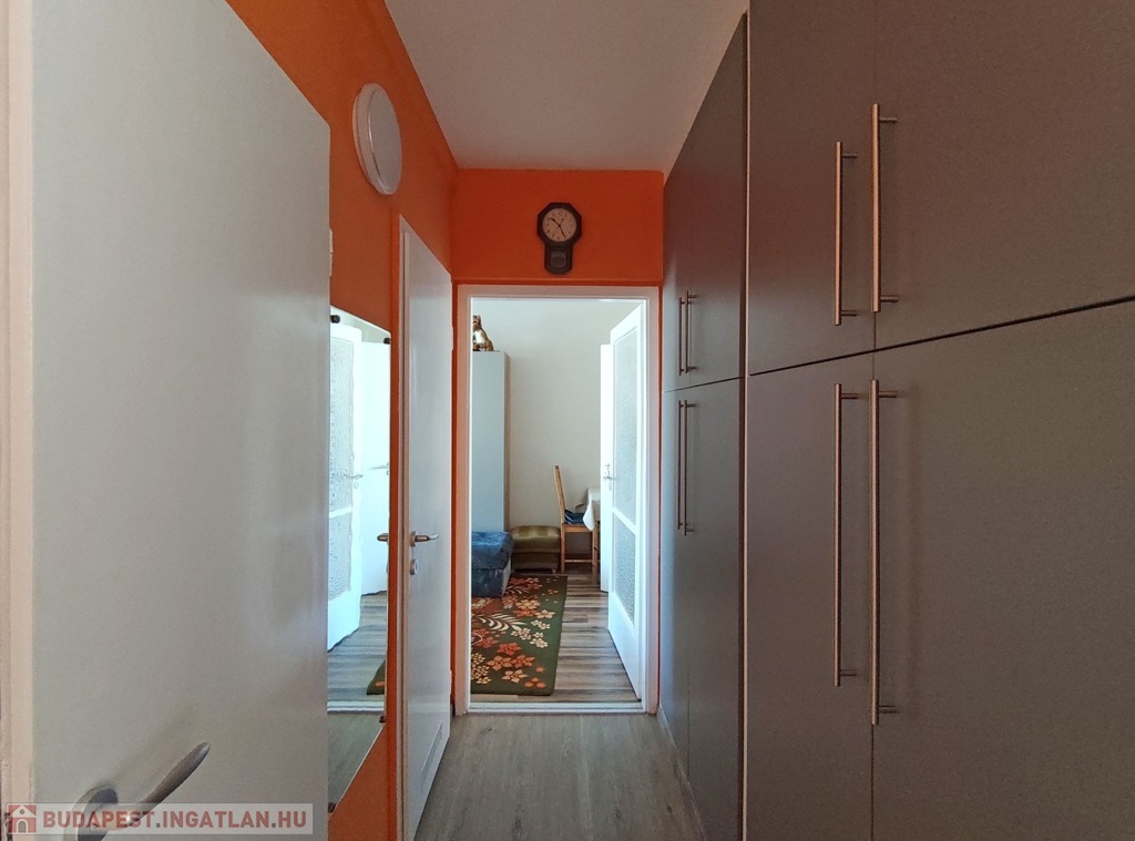 A 12 ponton záródó acél merevítéses biztonsági bejárati ajtón keresztül felújított és szépen karbantartott állapotú, a szobák elrendezését tekintve remek elosztású, délkeleti tájolású, loggiás lakásba érkezünk. A bejárattól az „L” alakú közlekedőben balra találjuk a konyhát, másik irányban bal oldalon a vizes helyiségek, jobb oldalon és szemben pedig a szobák nyílnak meg.