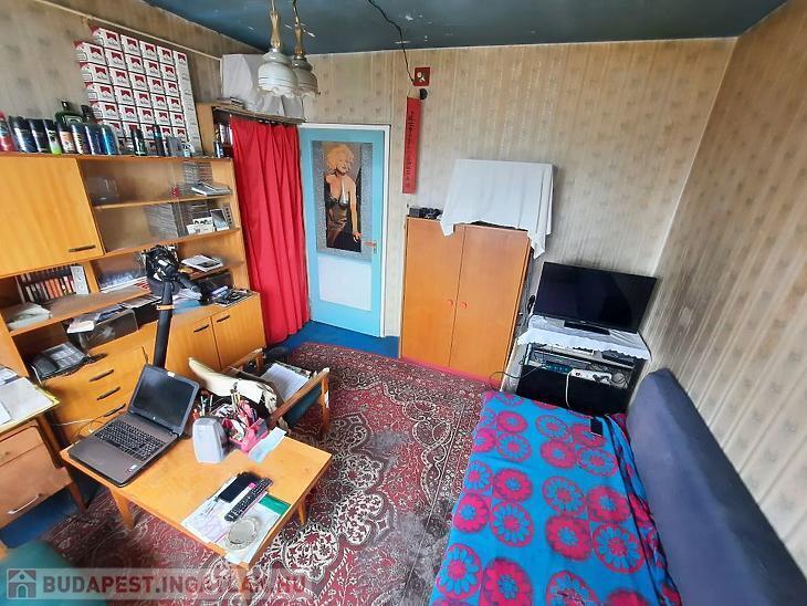 A kisebbik szoba padlószőnyeggel és régi tapétával burkolt, felújítandó, a nagyobbik szobában laminált parketta van, de a tapéta ott is még az régebbi.