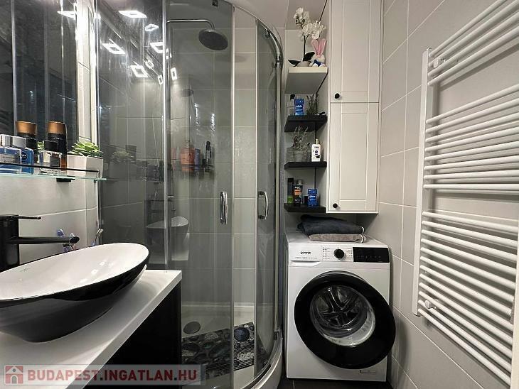 -A fürdőszoba burkolatai jó állapotúak, zuhanykabinnal felszerelt.