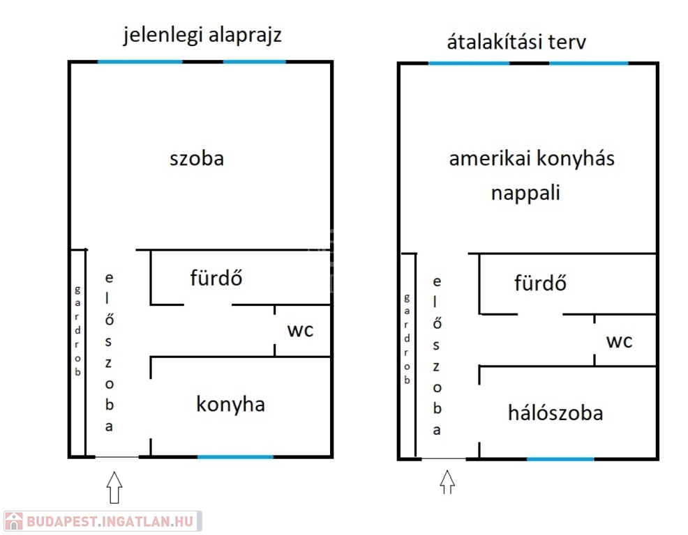 A konyha áthelyezésével egy amerikai konyhás nappali és egy hálószoba könnyedén kialakítható!