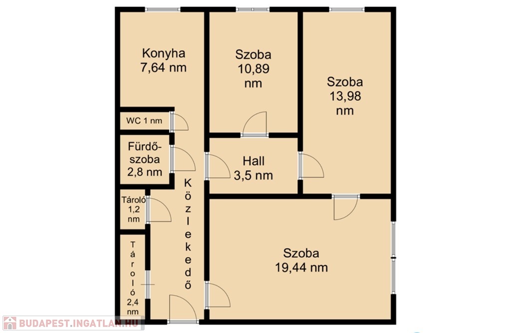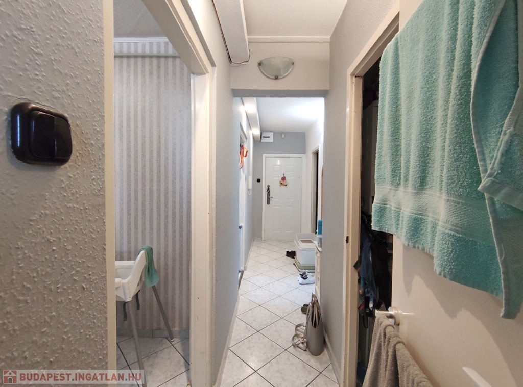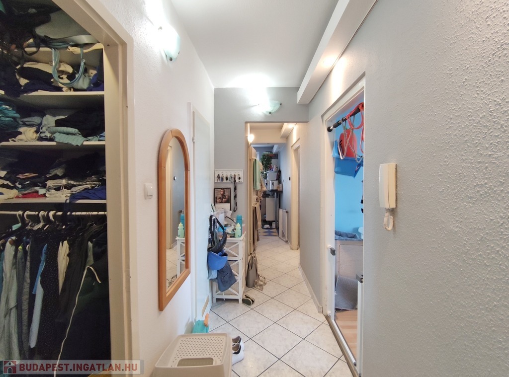 A több ponton záródó biztonsági bejárati ajtón keresztül részben felújított és karbantartott állapotú, a szobák elrendezését tekintve remek elosztású, hallos lakásba érkezünk. A bejárati ajtón belépve az előszobában közvetlenül jobb kéz felől a jó állapotú minőségi laminált parkettás, tágas, világos, panorámás, 19 nm-es, műanyag ablakos, redőnnyel szerelt nappaliba jutunk. A külön nyíló nappaliból és a közlekedőből nyíló kisebbik, minőségi laminált padlós 11 nm-es szobából is a 14 nm-es, szintén minőségi laminált parkettás, műanyag ablakos hálószobába eljuthatunk. A bejárathoz visszamenve a közlekedőben balra haladva a 2,34 nm-es, járólapos és polcos gardrób, mellette pedig a 0,8 nm-es, járólapos, polcozott kamra kapott helyet. Ezután a 2,9 nm-es kádas fürdőszobát, mellette pedig a 0,8 nm-es mellékhelyiséget találjuk. A közlekedő végében járólapos, nagyméretű műanyag ablakos, redőnyös, tágas és nagyon világos 7,6 nm-es, konyhabútorral szerelt és gépesített konyhába juthatunk el.