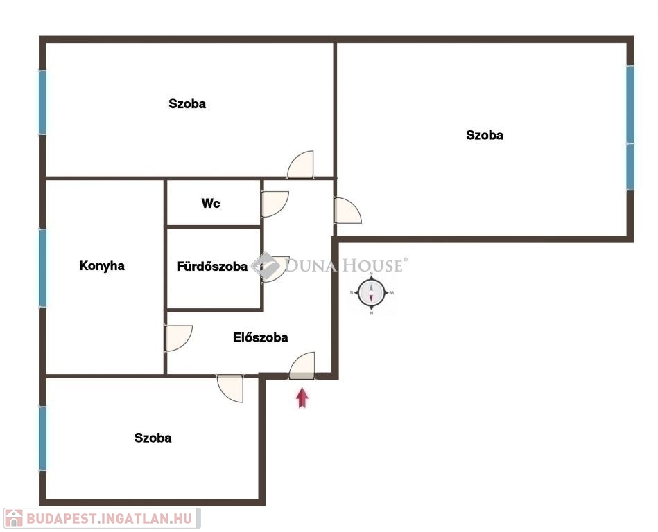 Az ingatlanban egy tágas nappaliszoba, két hálószoba (mind külön bejáratúak), egy ablakos konyha, egy fürdőszoba, egy wc, és a helyiségeket összekötő előszoba - közlekedő helyiségek kaptak helyet. A lakás kifejezetten parktikus elrendezésű, különnyíló helyiségei okán családosoknak is ideális.
