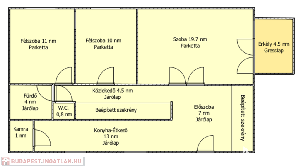 A lakásban nappali, panorámás erkély, 2 külön nyíló hálószoba, fürdőszoba (ablakos), külön nyíló W.C., közlekedő, konyha-étkező (ablakos), kamra, előszoba található.