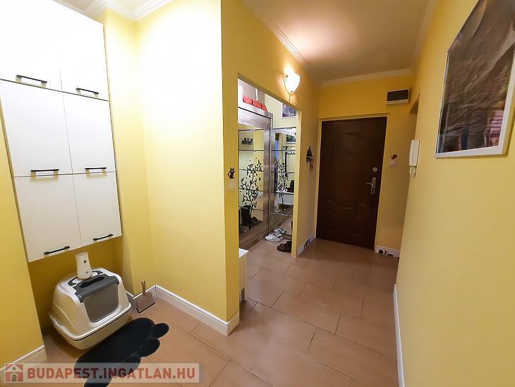 A lakás praktikus elosztású: 2+1 szoba, ablakos konyha, külön fürdő és WC, valamint két tárolóhelyiség a lakáson belül, egy gardrób és egy nyitott spejz . A burkolatok jó állapotúak, a szobákban laminált parketta, a közlekedő és a konyhában pedig járólap található. A lakásban teljes körű villamossági vezeték csere történt. A konyhabútor gépesítve a vételár részét képezi. Egyéb bútorok megbeszélés tárgyai. A bejárati és a belső ajtók cseréje megtörtént. Hűtő-fütő klíma került beszerelésre. Az ablakok régebbiek de lelettek festve.