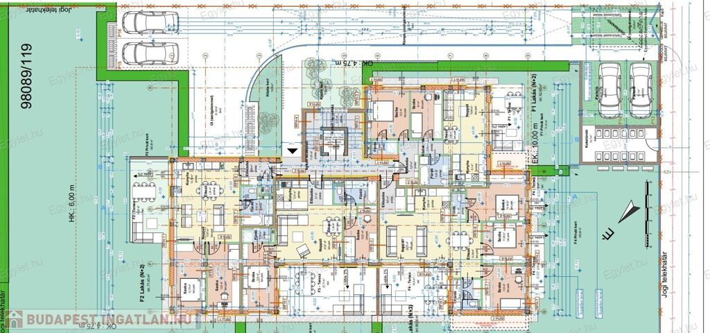 Elektromos kapu, minden lakáshoz udvaron belüli parkolóhely vagy/és teremgarázs került kialakításra felár ellenében.
