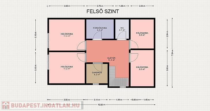 A szobák külön nyílóak, melyek laminált burkolattal rendelkeznek, a konyha és a vizes helyiségek pedig járólaposak. A lakás melegéről turbós kombi cirkó gondoskodik, egyedi méréssel. A nyílászárók az alsó szinten műanyagok a tetőtérben fából vannak és redőnnyel ellátottak. A lakás dupla komfortos alsó szinten kádas fürdőszoba található míg az emeleten zuhanyzó került beépítésre, külön mellékhelyiséggel. A beépített bútorok a vételár részét képezik.