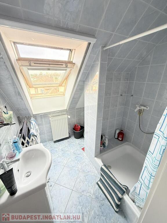 A szobák külön nyílóak, melyek laminált burkolattal rendelkeznek, a konyha és a vizes helyiségek pedig járólaposak. A lakás melegéről turbós kombi cirkó gondoskodik, egyedi méréssel. A nyílászárók az alsó szinten műanyagok a tetőtérben fából vannak és redőnnyel ellátottak. A lakás dupla komfortos alsó szinten kádas fürdőszoba található míg az emeleten zuhanyzó került beépítésre, külön mellékhelyiséggel. A beépített bútorok a vételár részét képezik.