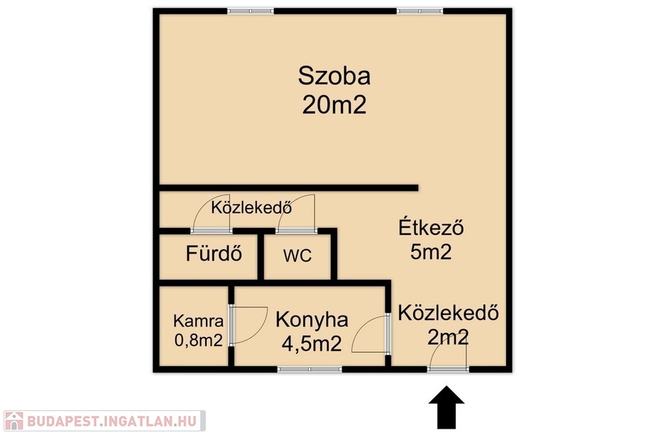 A lakásba belépve egy előszobába érkezünk, onnan balra helyezkedik el az ablakos konyha, amihez egy kamra is tartozik. Az előszobából tovább haladva az étkezőbe érkezünk, onnan balra egy közlekedő nyílik, aminek a jobb oldalán egy beépített gardrób szekrény van és balra nyílik a szeparált mellékhelyiség és a kádas fürdőszoba. Az étkezőből egyenes tovább haladva jutunk el a szobáig, ami az elhelyezkedés miatt nyáron nagyon kellemes hőmérsékletű.